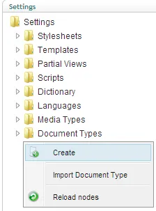 Right click on Document Types under Settings and select Create from the context menu (as shown in figure 3) to create a new Document Type.