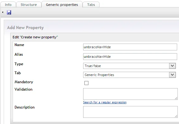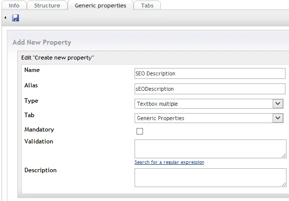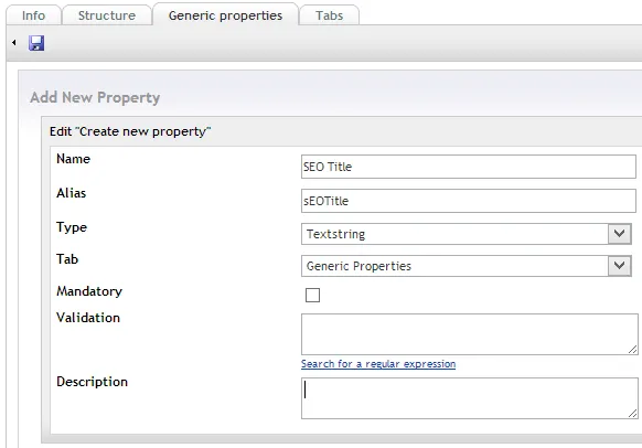 The [Pagebase] document type will open in the editor. Switch to the Generic properties tab and click on the Click here to add a new property bar to add the 3 properties as listed below and save them. Figures 5 to 7 show them being added.
