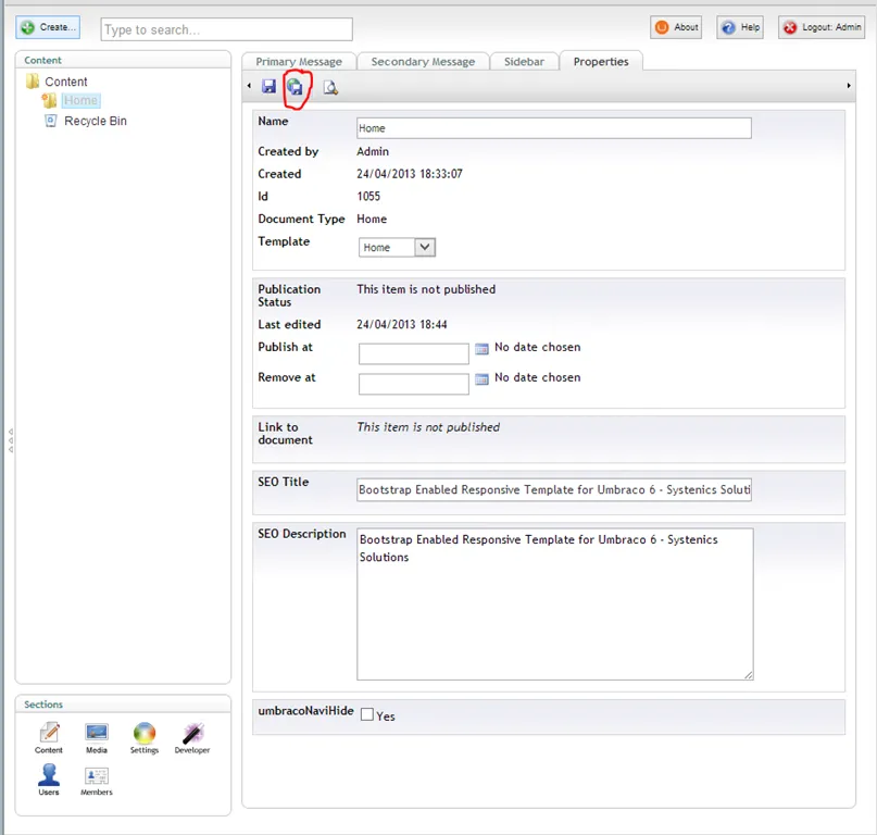 Fill up the content of each of the Home page tabs and save them as you proceed. Its important that you also fill up the SEO Title and SEO Description properties on the Properties tab. You can see that even though these properties were defined on the [PageBase] document type, they have been inherited by the Home document type. Once you have filled all the information, click on the Save and Publish icon (circled red in Figure 10) to publish the page and make it available for everyone to view.