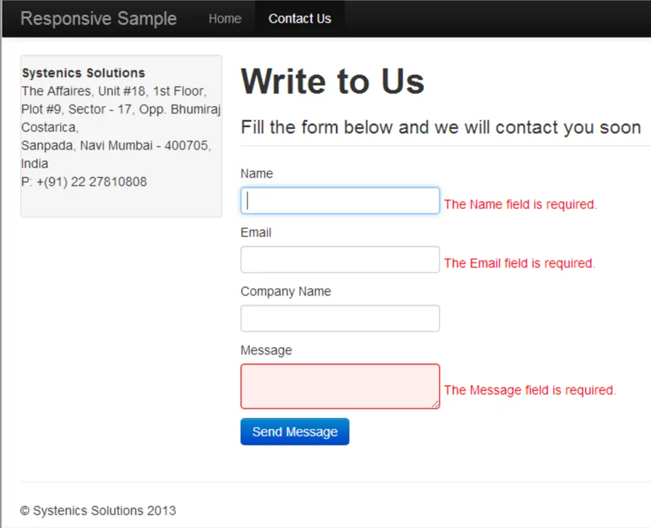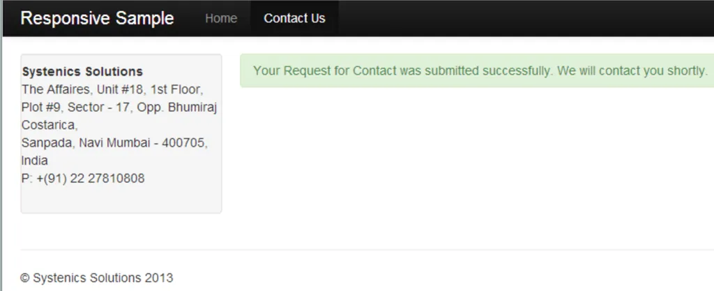 You can see from the code above that our partial view inherits from the generic Umbraco.Web.Mvc.UmbracoViewPage<T> class which is instantiated to our MVCUmbraco.Models.Contact class type. We do this so that our Model class is available as a model in our partial view. Next we use Ajax.BeginForm helper to define our Ajax enabled form, just like we use in normal ASP.NET MVC 4 forms. We pass the action and controller name as parameters, make sure you have them correctly defined else your form will keep giving all kinds of errors. We also pass an AjaxOptions object to the helper and define that we want to replace the contents of the target div upon success of the form. We also hook up the OnFailure and OnSuccess client side events to appropriate JavaScript methods. We then define the the MVC controls for the Model. You will note that the form has been styled as per Bootstrap guidelines. The ShowError and ShowSuccess JavaScript methods use appropriate Bootstrap classes to display styled alerts.