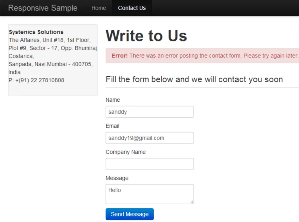 Now that we have the Contact Us document type and template all set, we need to create the Contact Us page. Click on Content under Settings and right-click on the Home page under Content tree and select Create from the context menu. In the create dialog provide the page name as Contact Us and choose the document type as Contact Us and click Create to create the content page. Provide the appropriate Contact Information (your address) under the Contact Information tab, then switch to the Generic Properties tab and provide the information for the SEO Title and SEO Description for the page. Now you are all set, click Save and Publish icon to save and publish the page. The figures below show screenshot of the application in various stages. Please note that if you are having errors with the form the first step to trouble shoot is to ensure that you have provided the right SMTP configuration details in the ContactControler class.