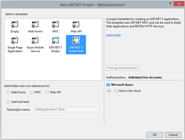 Enter the location to create the project as well as the name of the project and solution and click OK. I have kept default names since the purpose for us is to determine the contents of the project items rather than its naming in the blog. The next dialog brings up the selection of the type of ASP.NET project you want to create this is similar to the dialog introduced in Visual Studio 2013. If you select MVC or Web API then it will create a project in older Visual Studio 2013 compatible project format. Our goal in this blog is to explore the new ASP.NET 5 project template, so select the ASP.NET 5 Starter Web template and click OK to create the project. You will see that unlike older MVC or Web API projects where you had a selection of Add folders and core references for to select support for Web Forms, MVC or Web API needed in your project, this option is grayed out since ASP.NET 5 unifies all these into a single project.