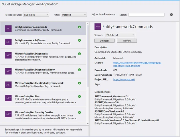 As you can see from figure 4 the interface for the package manager is changed. The tree view for Installed, Available and Upgrade packages has been removed in favor of a Filter for the packages. Plus whole lot more details about a package are shown as well as their dependencies are clearly listed in the details view. One of the biggest issue that I see right now is that there is no clarity if the package is ASP.NET 5 compatible or not. Or to be more precise if the package contains only server side code or server and client side libraries. Today nothing stops a developer to shoot themselves by trying to install a client library like Bootstrap from nuget. Although the project folder structure has changed installing a client package succeeds but it fails when you try to build the project. There needs to be a clear way to understand which libraries are safe for ASP.NET v5 and which are not. Unless MS does this clear distinction there is bound to be a lot of developer frustration. Expecting that the developer will know about the client library support just looking at the list of dependencies seems to be a mistake.